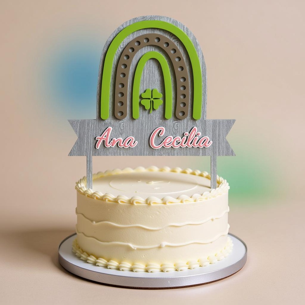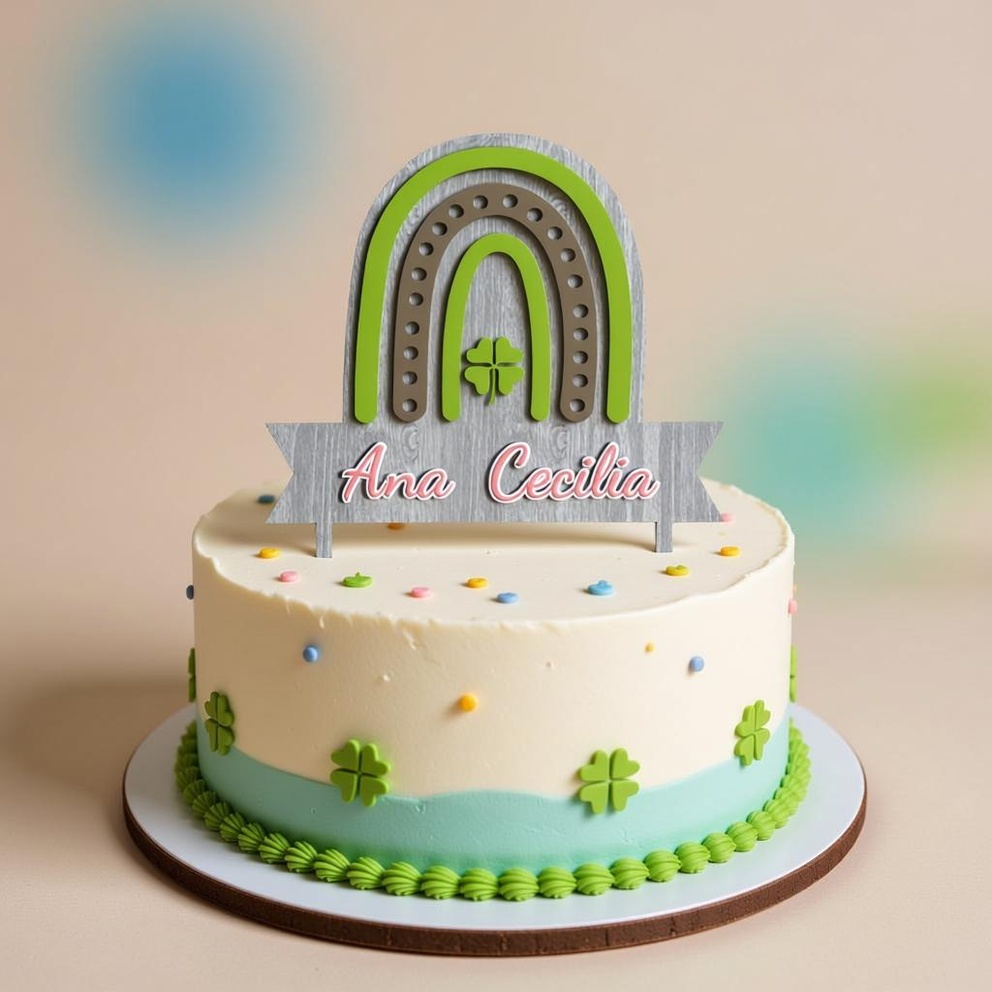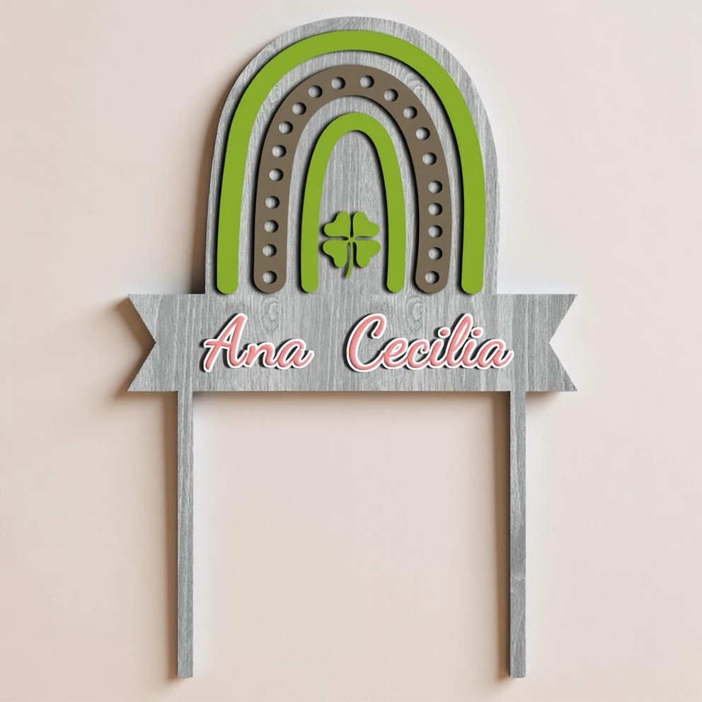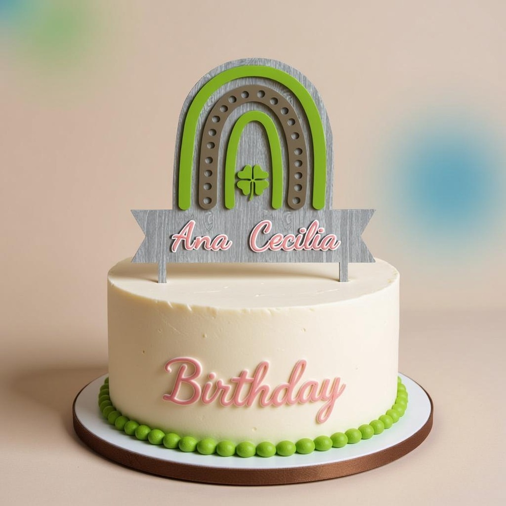 Designed with layered arches in fresh lime green and earthy tones, complete with dotted details and a central four-leaf clover emblem, it exudes a whimsical, nature-inspired vibe. The wooden-textured ribbon banner allows for custom scripting of any name (such as “Ana Cecilia”) in elegant cursive font.