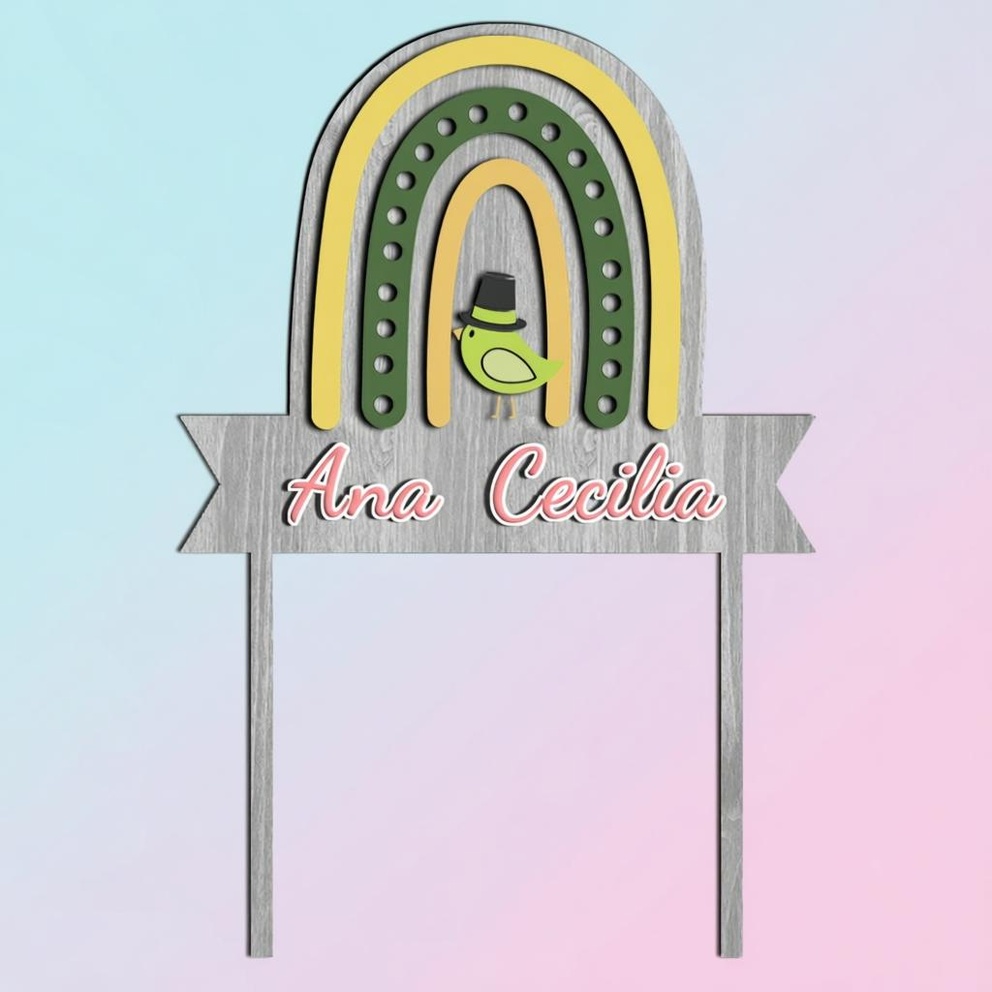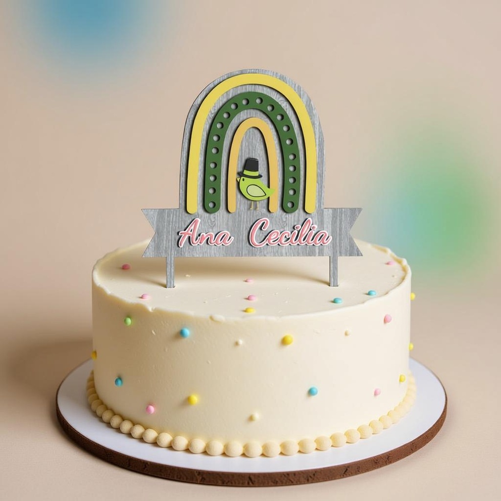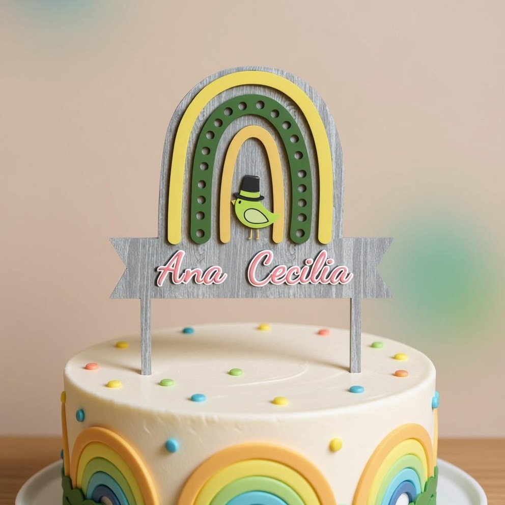 This adorable personalized cake topper is a whimsical addition to any birthday party, baby shower, or boho-themed celebration. It features a layered boho-style rainbow in soft yellow and green tones, with playful dotted accents on the outer arches for a modern touch. At the center sits a cute little green bird wearing a gentleman’s top hat, adding a fun and charming personality to the design. The rustic wood-grain base includes a customizable ribbon banner with the name beautifully scripted in pink cursive—displayed here as “Ana Cecilia,” but fully personalized with any name you choose.