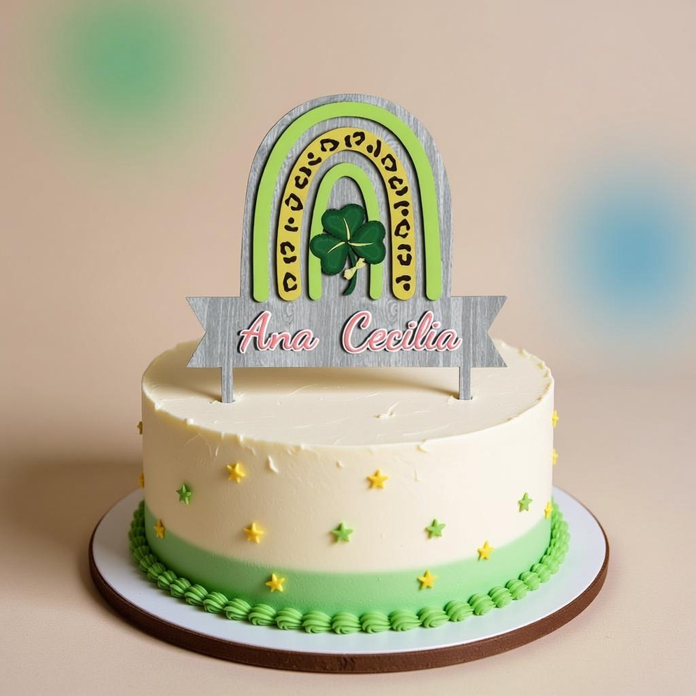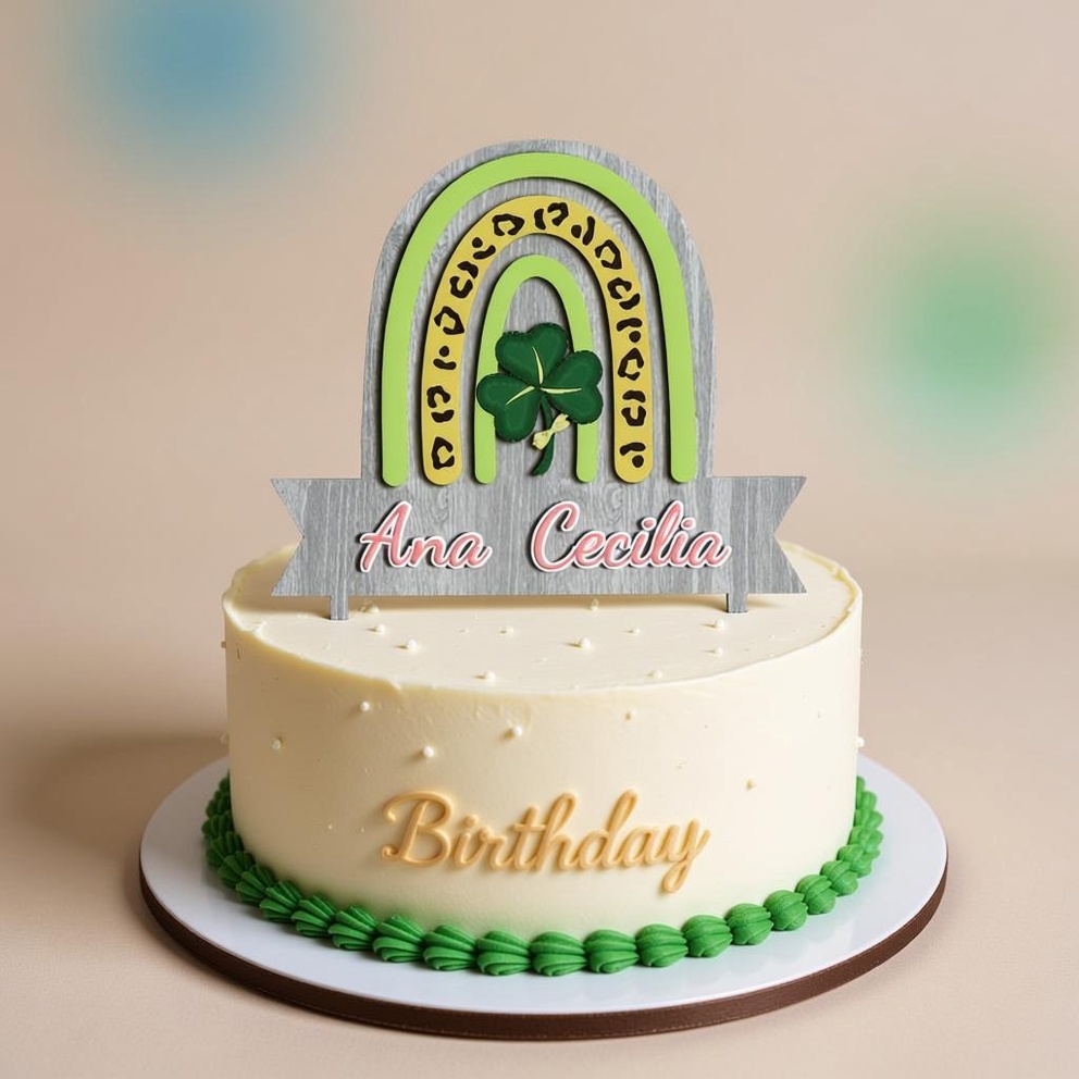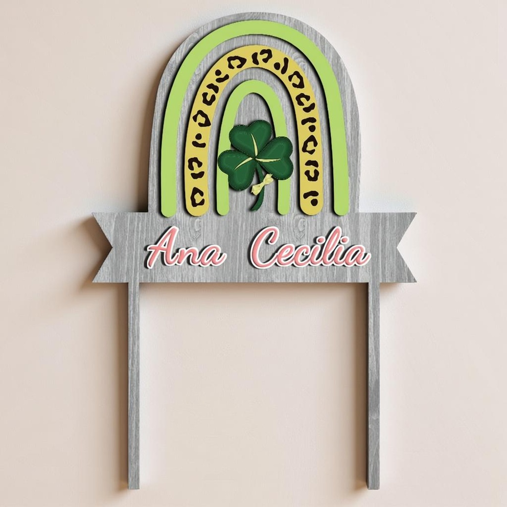 This charming personalized cake topper is the perfect addition to any St. Patrick’s Day celebration, birthday party, or lucky-themed event. Featuring a vibrant rainbow design in shades of green and yellow with trendy leopard print accents on the inner arches, it’s topped with a glossy four-leaf clover (shamrock) symbolizing good luck. The rustic wood-grain base includes a customizable banner with the name elegantly scripted in pink cursive—shown here as “Ana Cecilia,” but fully personalized to your chosen name.