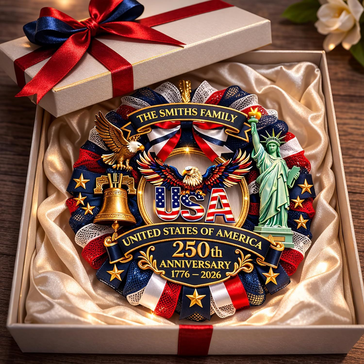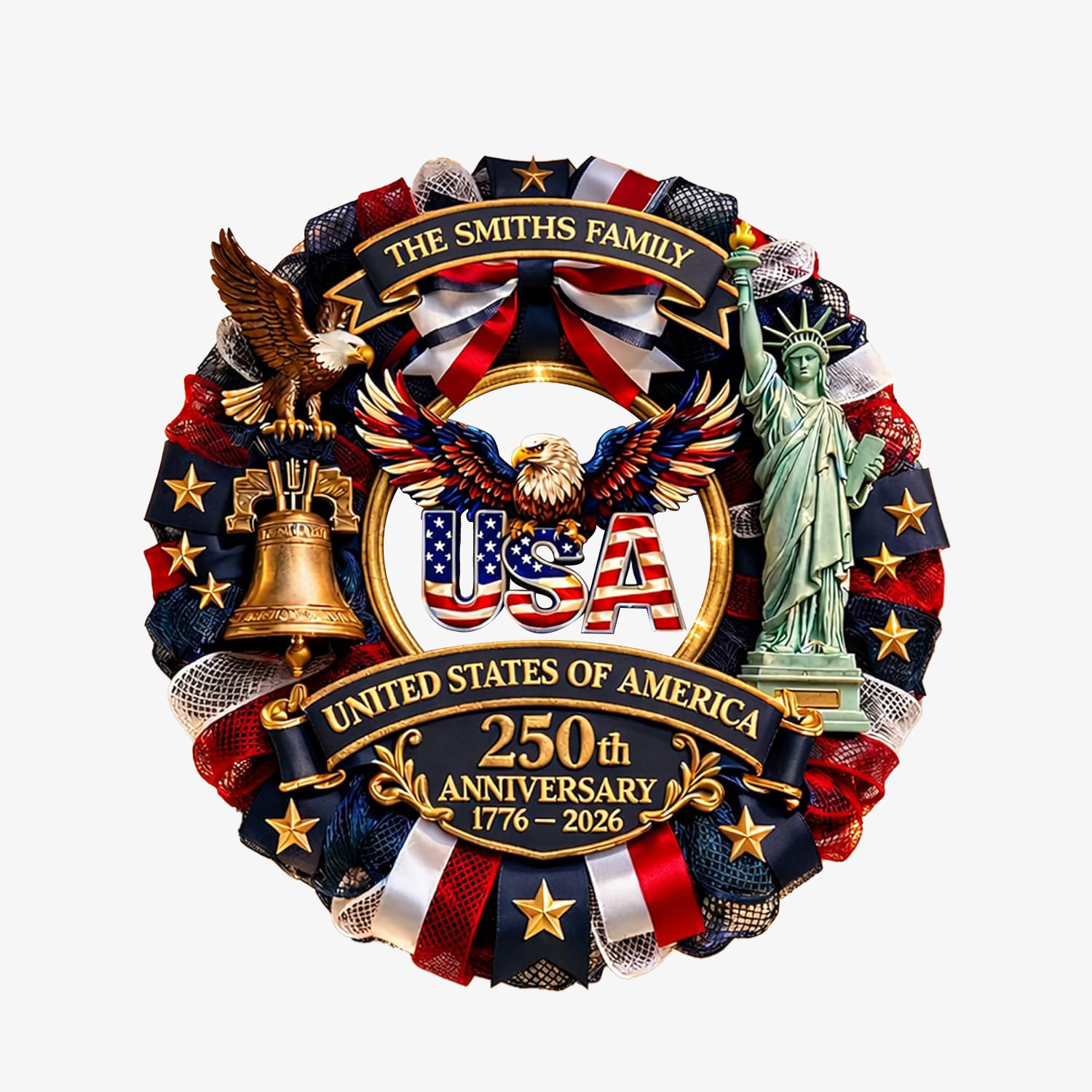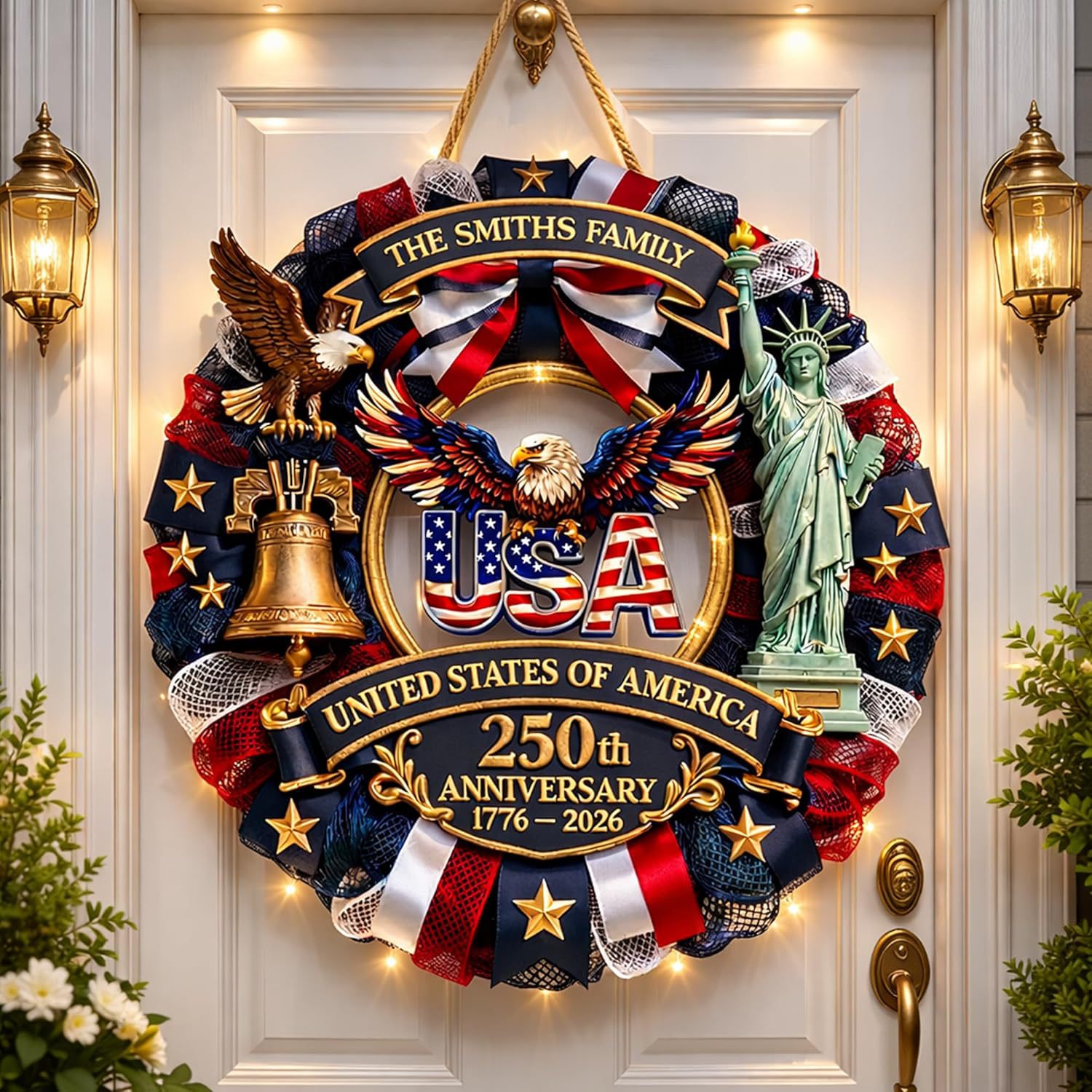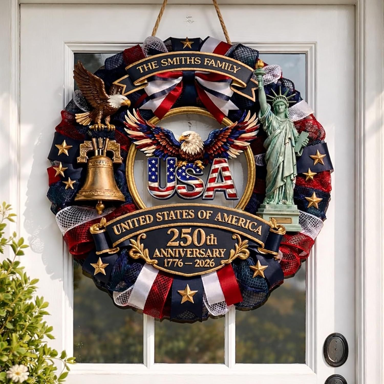 You can personalize the top banner with your family name (e.g., “The Smith Family”, “Johnson Family”, etc.). It transforms this wreath into a one-of-a-kind keepsake that celebrates both your family and America’s 250 years of freedom.