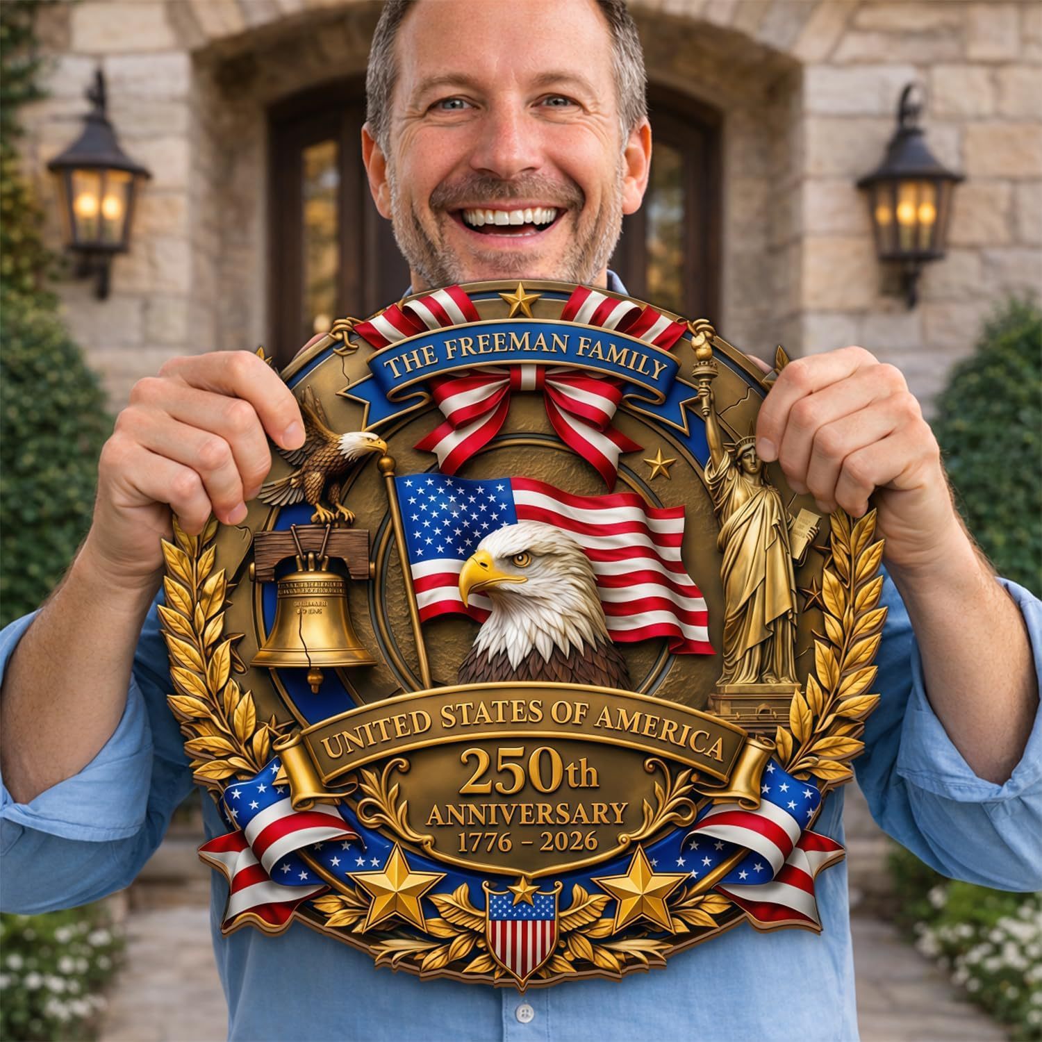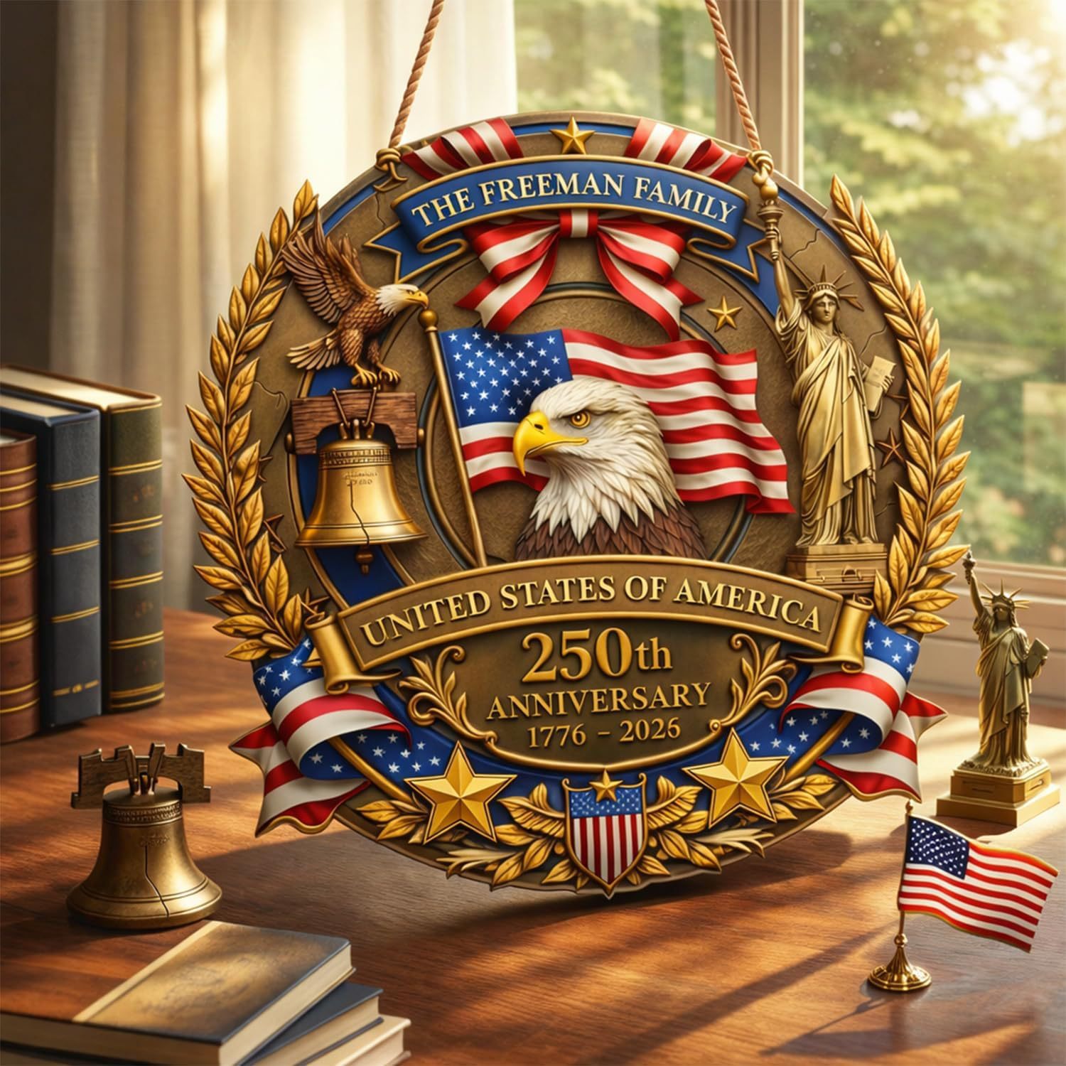 Honor the United States of America’s Semiquincentennial with this stunning Personalized Family Name USA 250th Anniversary Wood Wreath. Perfect for proudly displaying your family’s heritage during the 1776–2026 celebrations.