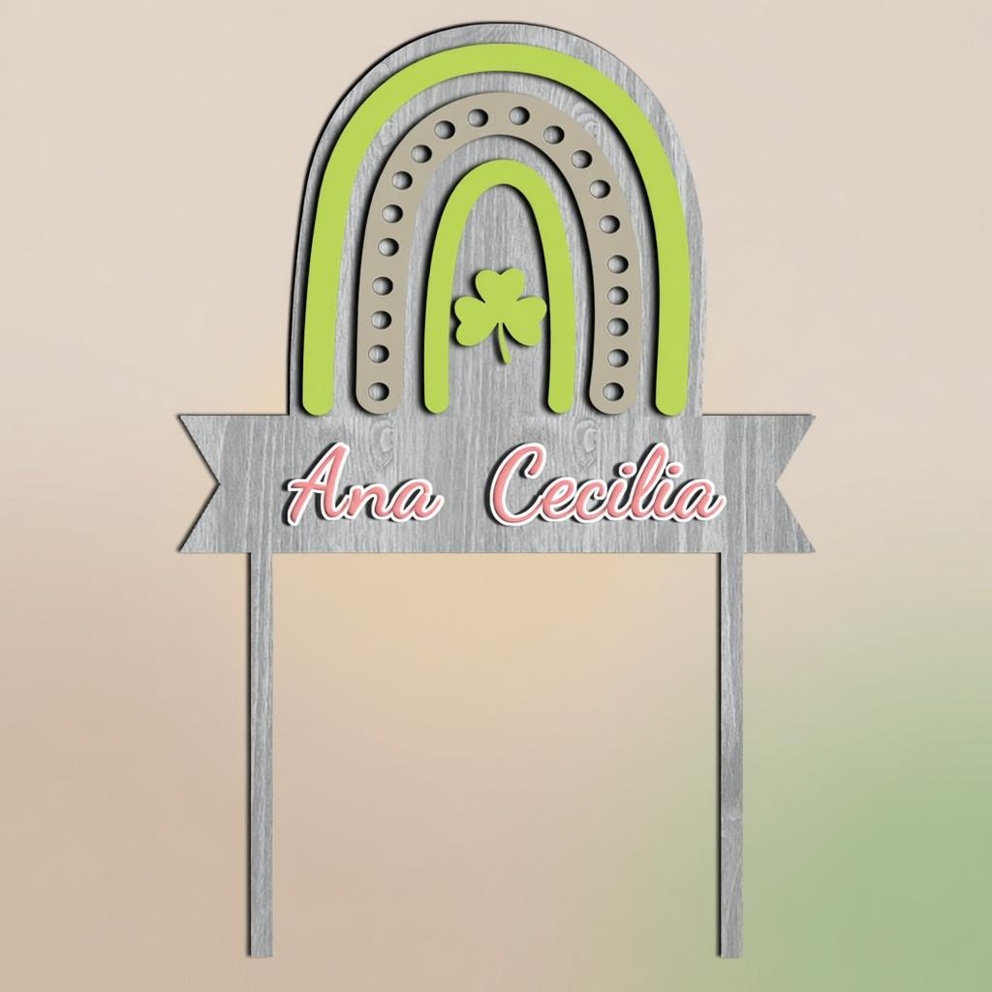 Personalized Neutral Tone Rainbow Four-Leaf Clover Cake Topper
