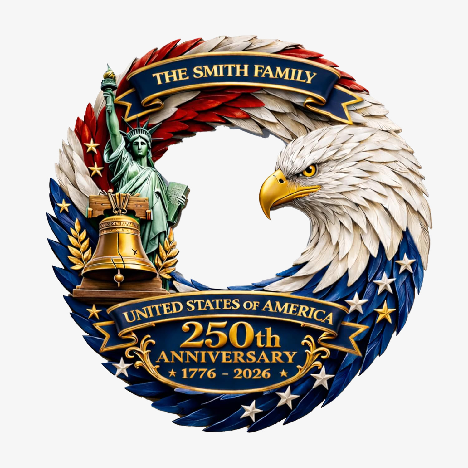 All-American Symbolism: Features the majestic bald eagle (America’s national bird), the Statue of Liberty, and the Liberty Bell, framed by a striking red, white, and blue feather wreath that mirrors the iconic U.S. flag color scheme, for an unmistakeable patriotic vibe.