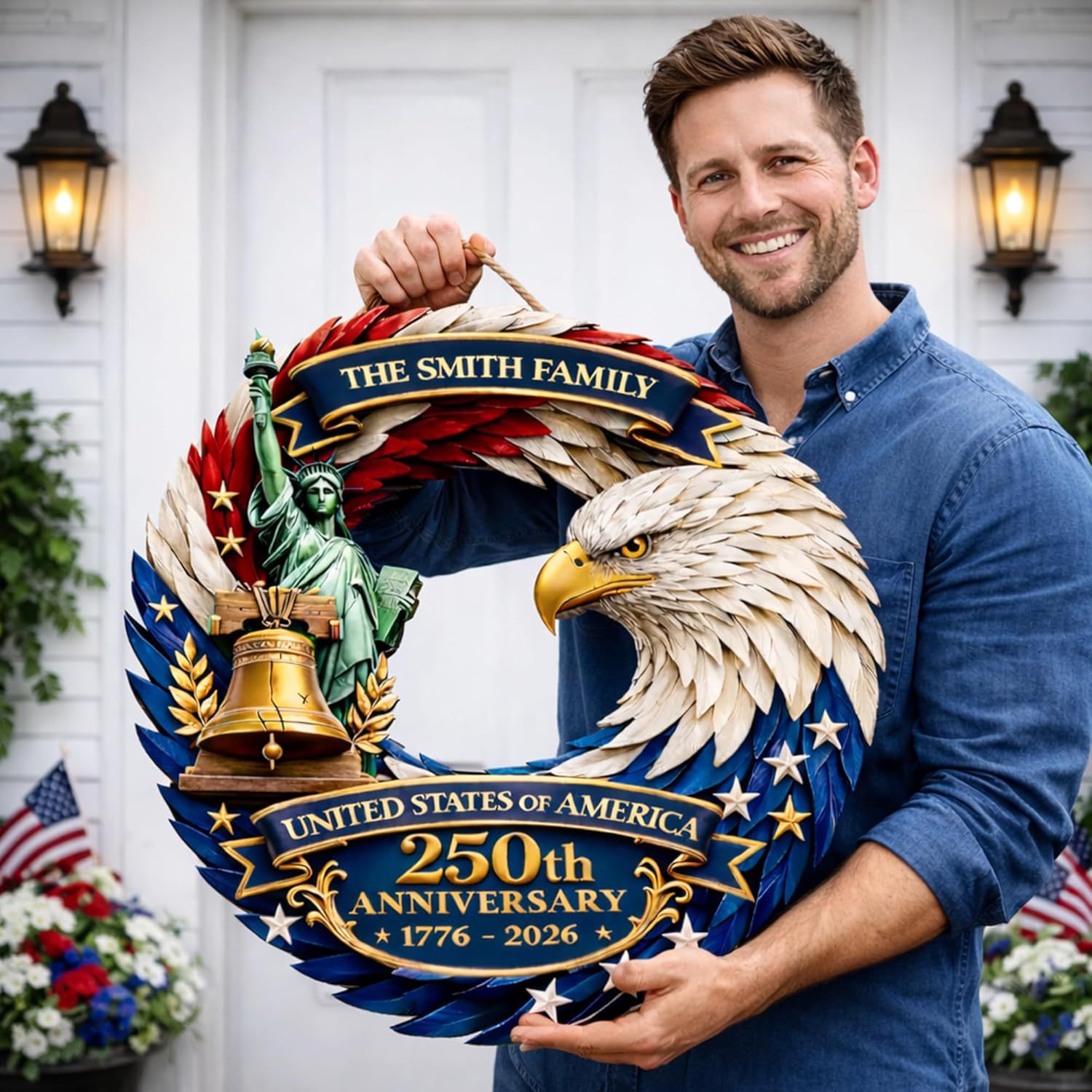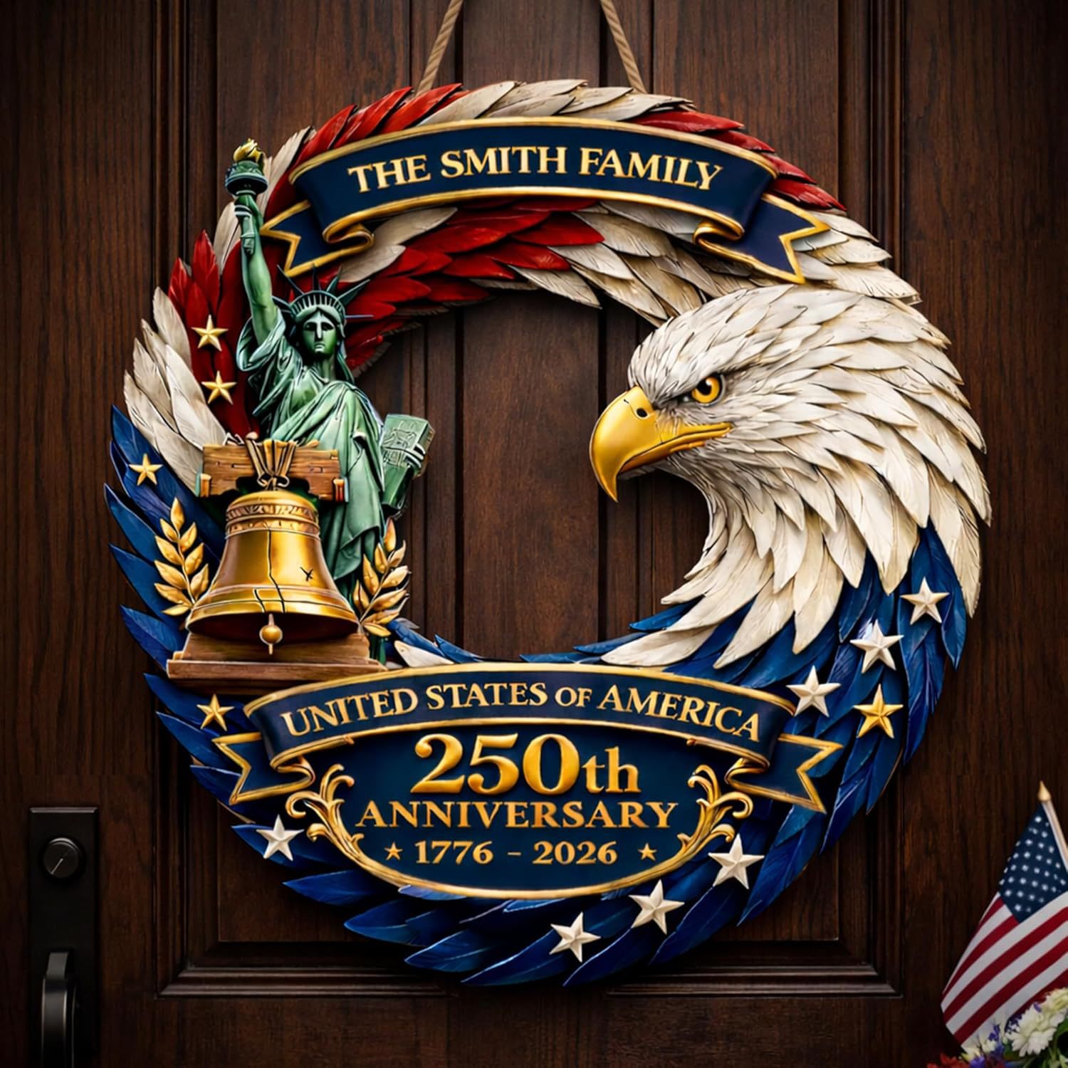 Personalized Family Name USA 250th Anniversary Wood Wreath, 1776-2026 Patriotic Door Hanger, Custom Semiquincentennial Independence Day Celebration Decor